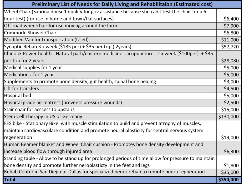 All monetary donations are deposited into Sabrina’s recovery journey account and go towards funding some of these much needed equipment and therapies